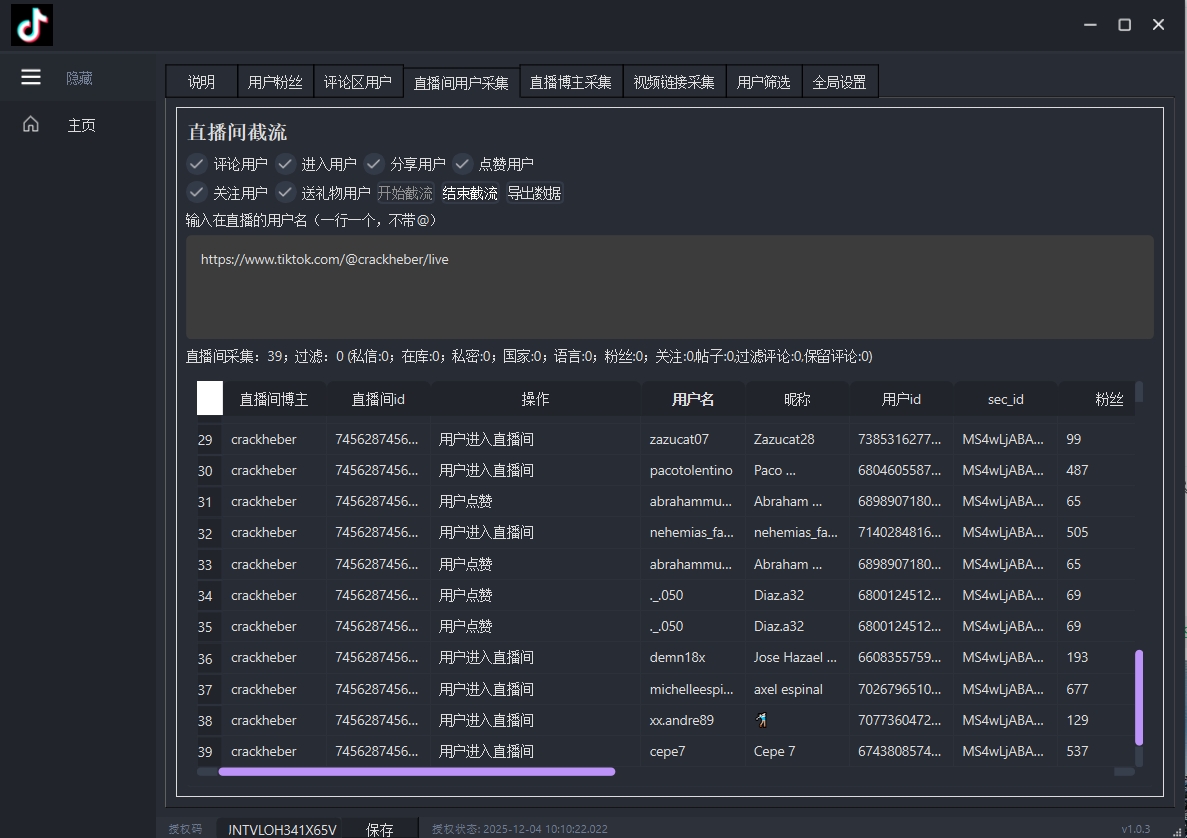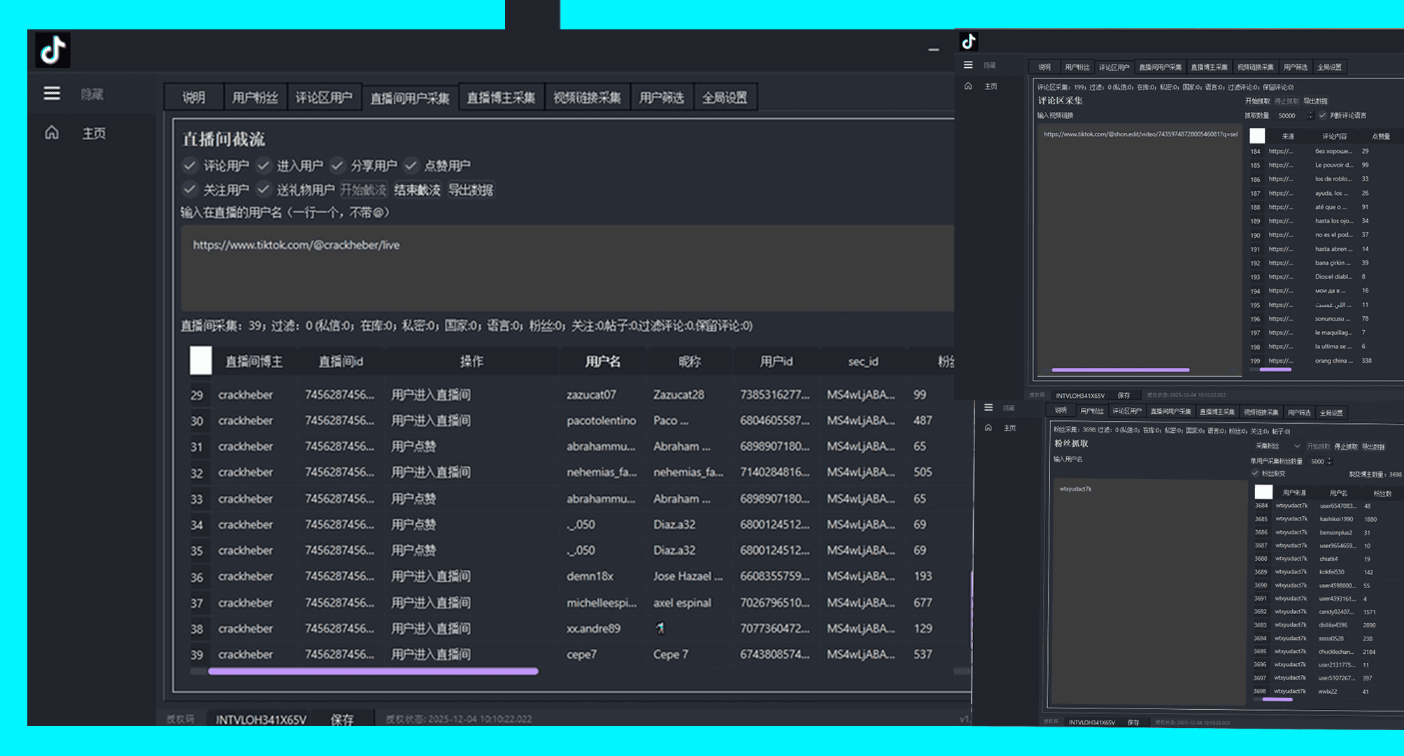 博主粉丝批量采集 视频评论区用户采集 同时多个直播间截流 采集正在直播的博主 按关键词采集视频链接等